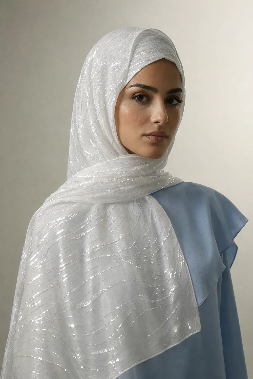 تم استلهام النسيج من خطوط متموجة تعكس الضوء بشكل طبيعي، مما يمنح الحجاب: